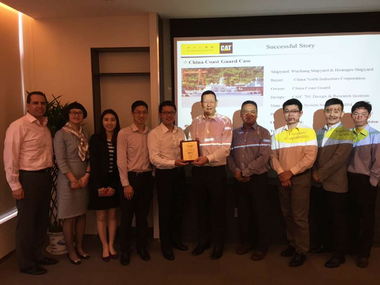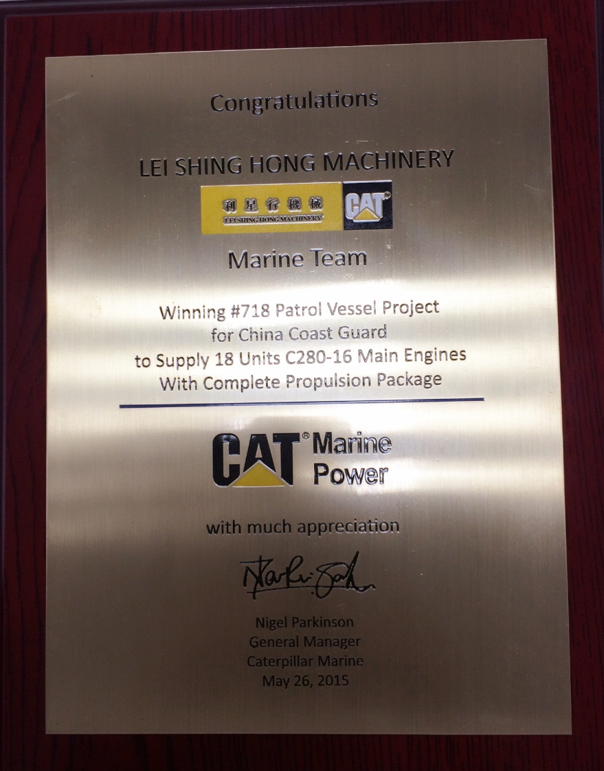 2015年5月26日,卡特彼勒船舶部董事總經理Nigel Parkinson及亞太區銷售經理陳耀明先生帶領其團隊成員到訪利星行機械發動機事業部。為了表彰利星行機械船機組在中國政府船市場中取得如此傲人的佳績,Nigel Parkinson先生向利星行機械船機組銷售總經理洪波先生頒發了榮譽獎牌,并對該項目團隊成員做出的貢獻與努力給予了高度的評價和肯定。
